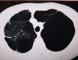 胸部CT发现华先生两侧肺都有葫芦样的巨大肺大疱,他两侧能正常呼吸的肺还不到50%。雪上加霜的是除了这些巨大肺大疱以外,在其周围还散在较多大小不一的肺大疱,就如同一张千疮百孔的渔网,破烂不堪。长久以来胸闷气短的原因也是因为这些肺大疱。